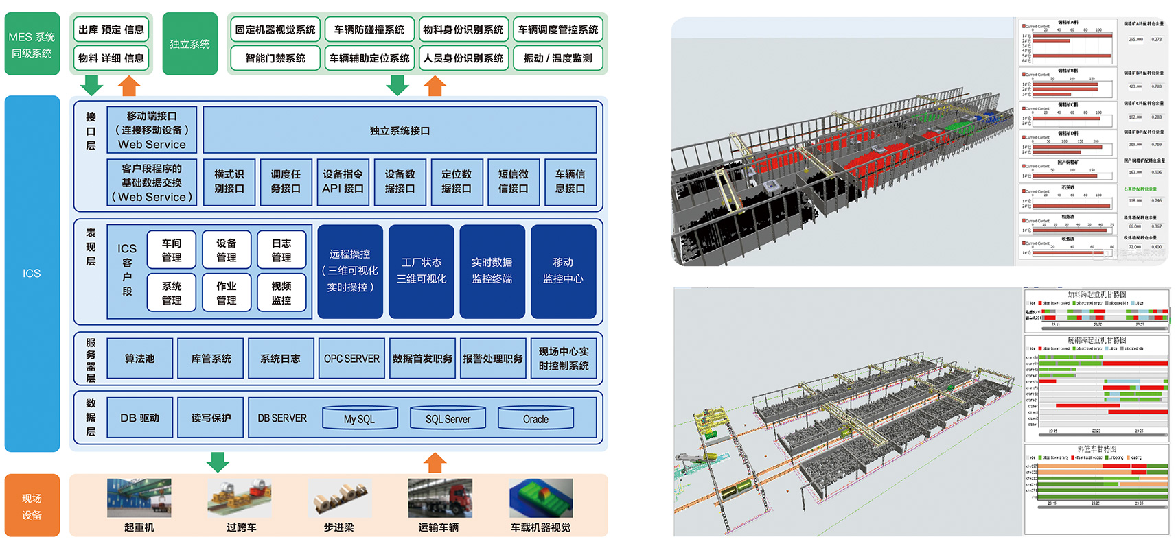 智能起重輸送是包含了庫區管理、調度算法、智能搬運等子系統,形成了感知、決策、執行的智能化整體解決方案。該系統在標準的生產流程、規范的操作過程的基礎上,通過位置傳感器、機器視覺等感知設備狀態、庫存狀態等環境信息,經庫區智能管理系統分析后自主分解生產計劃,通過智能調度、路徑規劃等技術形成運行指令,通過自主控制、精確定位等技術由智能設備自主完成任務指令并反饋執行結果。該系統還具有遠程運維、云服務及移動推送等功能,實現全生命周期管理和現場實時監控。
