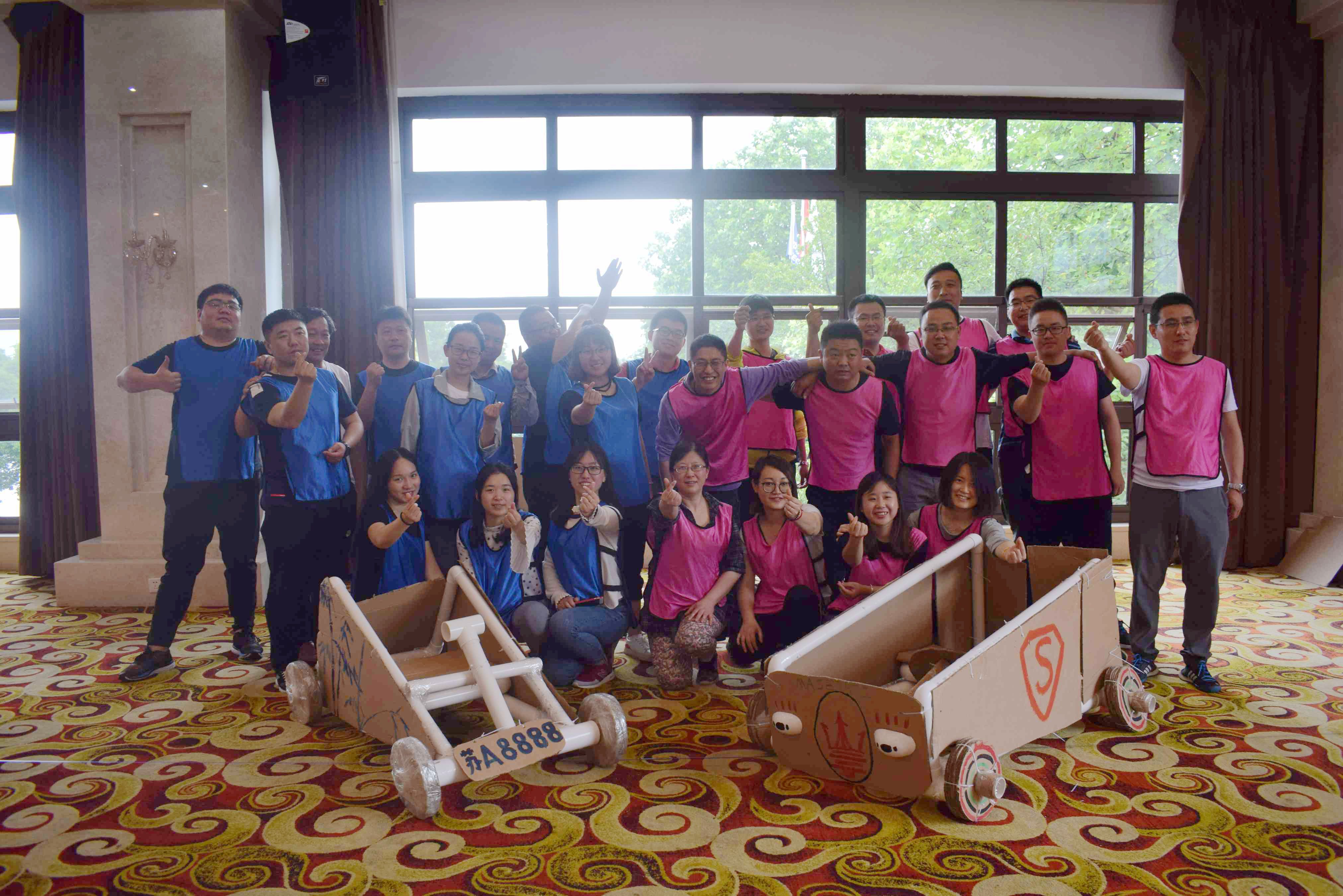 然后,按照教練的指示,大家隨機分成兩個小組,實現了從各自小團體“群龍取水”、“貪吃蛇”、“神筆馬良”、“指壓板障礙賽”到“F1方程式賽車”環節兩組的PK對擂。其中,“群龍取水”是推崇合理的分工與合作,加強團隊內部的協作與溝通,體會個人與團隊之間的相互作用;培養團結一致、密切配合、戰勝困難的團隊精神。“貪吃蛇”是實現團隊合作;在富有挑戰性的環境下實現良性溝通,密切配合,群策群力,共同解決逆境中的問題。“神筆馬良”是感受團隊協作中各成員之間的溝通方式與行為方式的變化并及時調整。“指壓板障礙賽”是增強團隊集體榮譽感,強調密切合作,風雨同舟。“F1方程式賽車”作為此次拓展的金牌項目,真正詮釋了集思廣益、分工明確,定崗定責的思想。讓同事關系更加親密、執行力更加夯實!