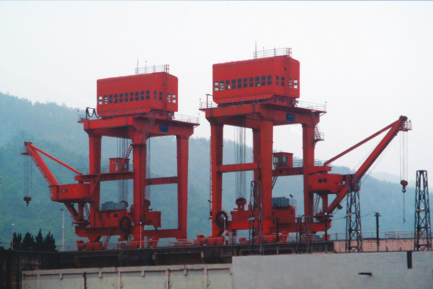 水電站門式起重機是一種門式多功能起重機,主要工作于水電站大壩壩頂或尾平臺,用于發電機組進水口工作門、排沙底口事故檢修門、攔污柵、泄洪水閘平板工作門等各類閘門的啟閉、搬運,用于機電設備安裝及壩頂其他設備的吊運等。大連重工研制的該類產品的主要技術特點:起重量大(最大1000t)、超載能力強、跨度較?。ǔ?0-20m)、起升高度大、配有自動化或智能化的水下液壓掛梁,可采用各種先進的電氣調速系統和PLC及網絡控制系統。