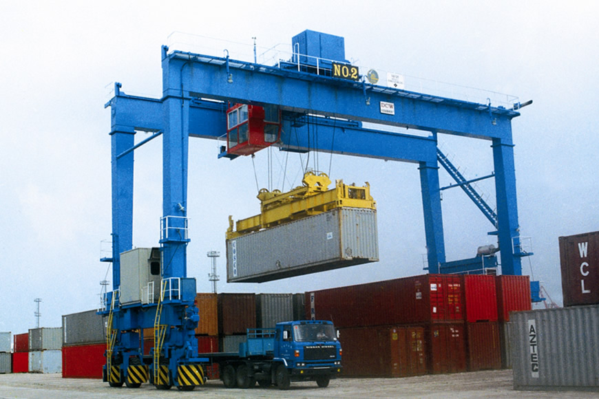 輪胎式集裝箱門式起重機方面,大連重工研制的該類產品適用于國際標準集裝箱的搬運及裝卸,設備性能先進,機動性好,對地面不平度敏感性小。目前產品主要機型為吊具下30.5噸—45噸。