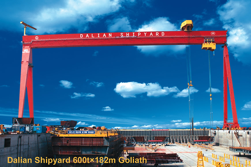造船門式起重機(jī)是一種大起重量、大跨度,多功能、高效率的門式起重機(jī),專用于船塢或船臺(tái)進(jìn)行大型船體分段、對接及翻轉(zhuǎn)作業(yè)。 大連重工自1999年研制出全變頻調(diào)速造船門式起重機(jī)以來,積累了豐富的機(jī)電設(shè)計(jì)、結(jié)構(gòu)分析計(jì)算、制造、運(yùn)輸、安裝和調(diào)試經(jīng)驗(yàn),形成了自主的核心技術(shù),至今已研制了200—800噸等不同規(guī)格的造船門式起重機(jī)。